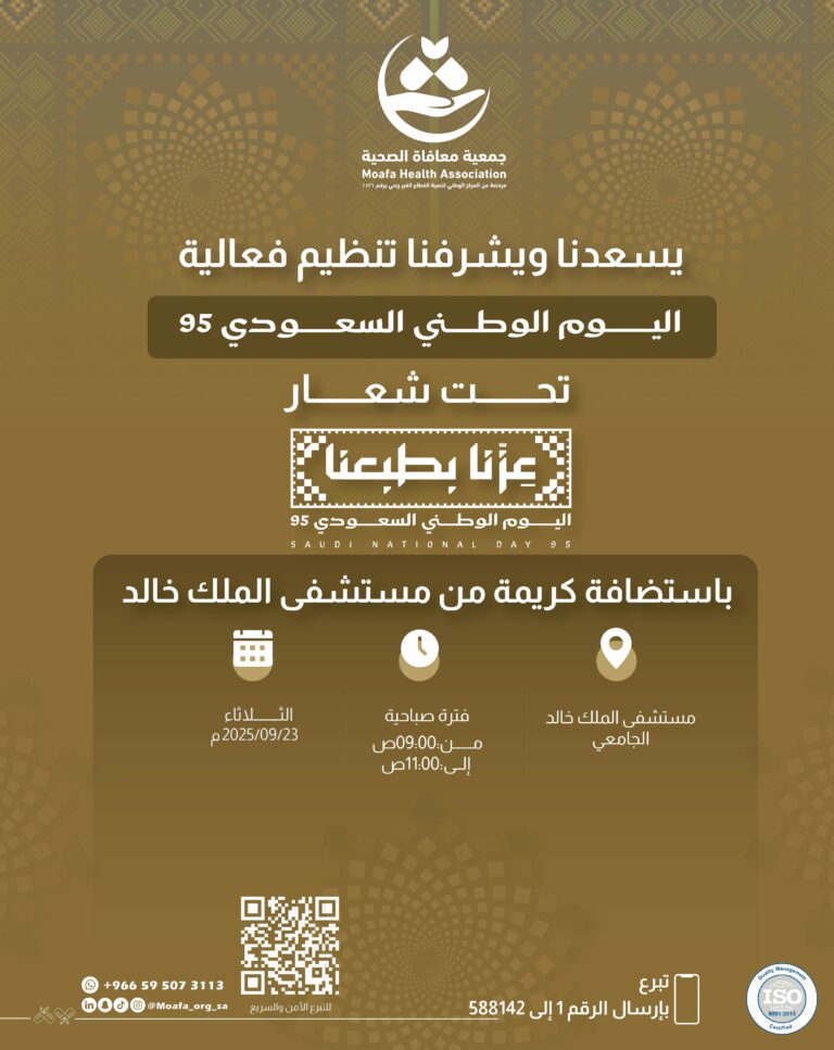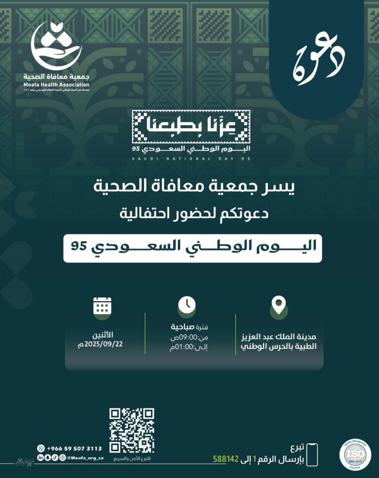 في يوم الوطن نحتفل بالمجد والعطاء ✨ ويسر جمعية معافاة الصحية أن تدعوكم لمشاركة فرحة اليوم الوطني السعودي 95 🎉